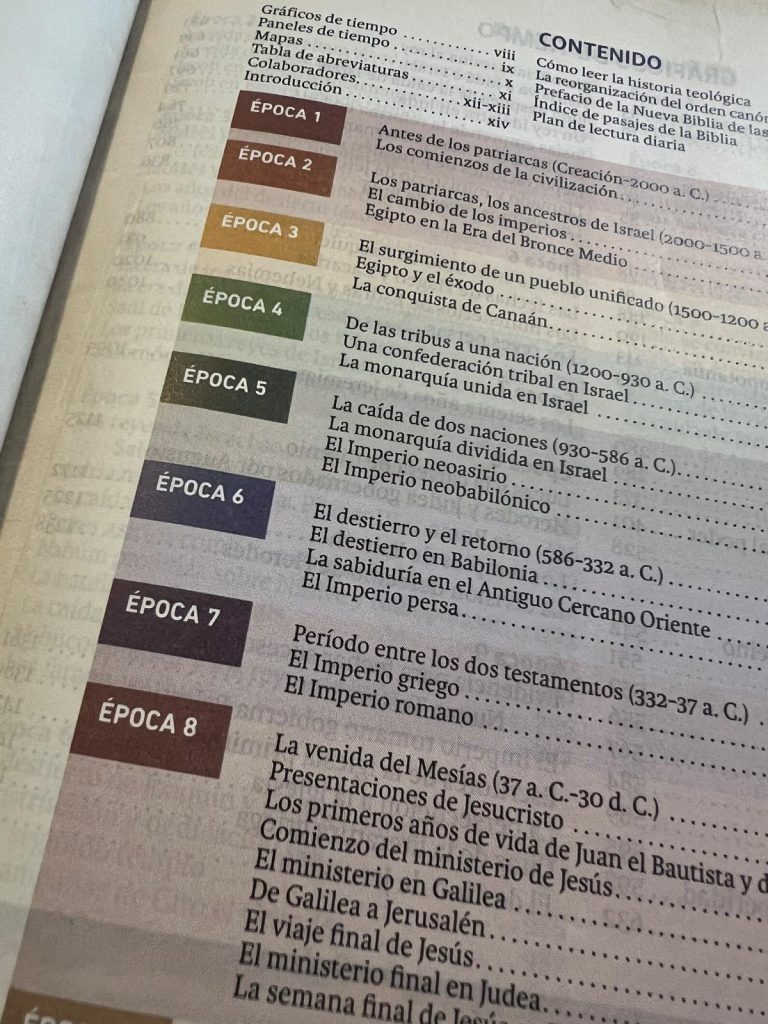 • El contenido se presenta dividido por grandes épocas de la historia bíblica.